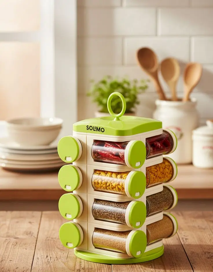 Ordená tus especias con un toque de color y funcionalidad gracias a este especiero giratorio con 16 frascos, cada uno con tapita verde. Su base giratoria 360° permite acceder fácilmente a cualquier condimento, mientras que sus frascos transparentes facilitan la identificación rápida de cada especia. Ideal para mantener la mesada organizada y tus condimentos al alcance.